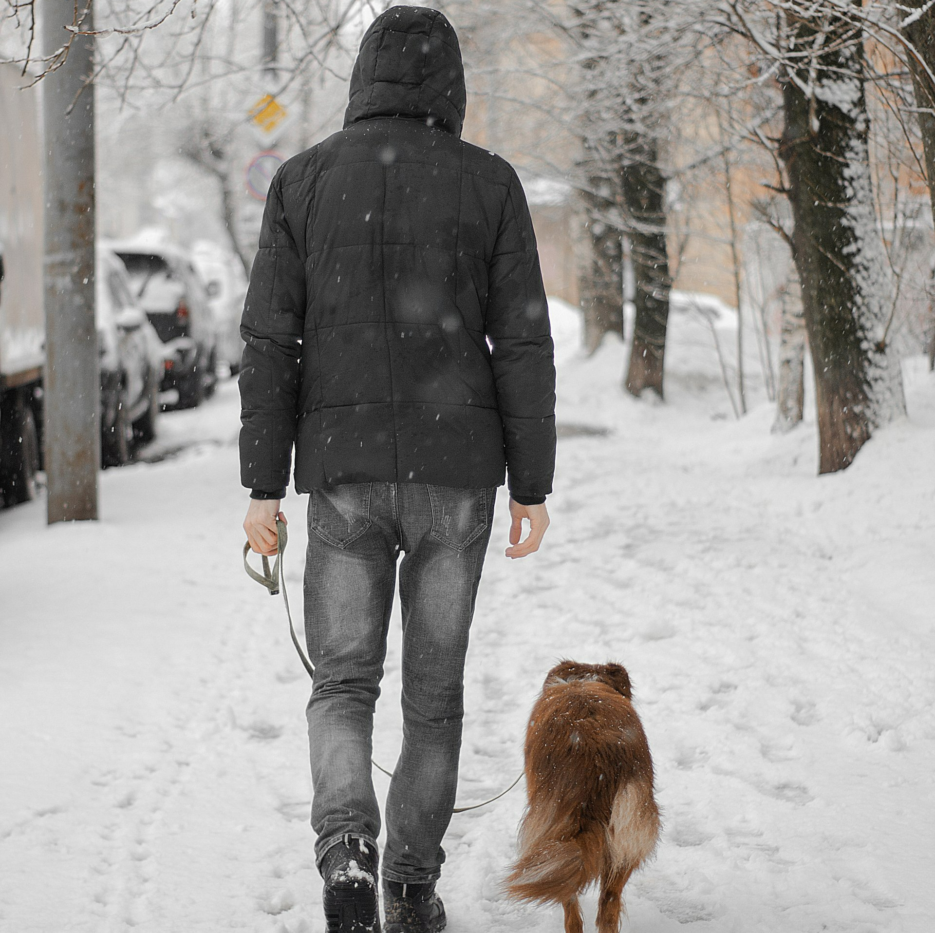 Peter knackar på hos grannen och erbjuder sig att gå ut med hunden.